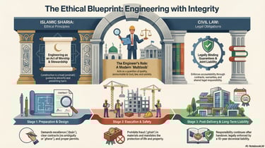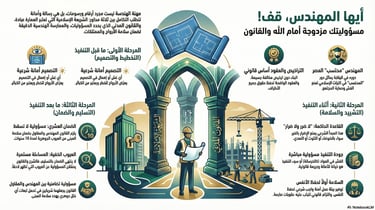 يسلّط الضوء على مسؤوليات المهندس والمالك والمقاول من لحظة الفكرة وحتى ما بعد التسليم، موضحًا البعد الشرعي والقانوني لكل إجراء هندسي.