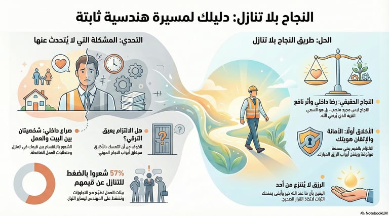يقدم هذا الكتاب "النجاح بلا تنازل" نظرة إرشادية وتوجيهية للمهندسين حول كيفية تحقيق النجاح المهني المستدام دون المساومة على المبادئ والقيم الإسلامية. يؤكد الكتاب على أن الالتزام الأخلاقي، خاصة في مهنة الهندسة، ليس خيارًا إضافيًا بل هو أساس العمل ومفتاح البركة، ويستعرض تحديات بيئة العمل، مثل ازدواجية الشخصية والضغط للتنازل، وكذلك يوضح الكتاب كيف يكون الإتقان والصدق والأمانة عبادة عملية ورصيدًا مهنيًا. وأهمية النية في تحويل العمل إلى عبادة، ويناقش القواعد الشرعية في اختيار المشاريع، ويشدد على ضرورة تحقيق التوازن بين العائد المادي والمبدأ الأخلاقي، مدعوم بقصص واقعية لمهندسين صمدوا وثبتوا في وجه الانحرافات.